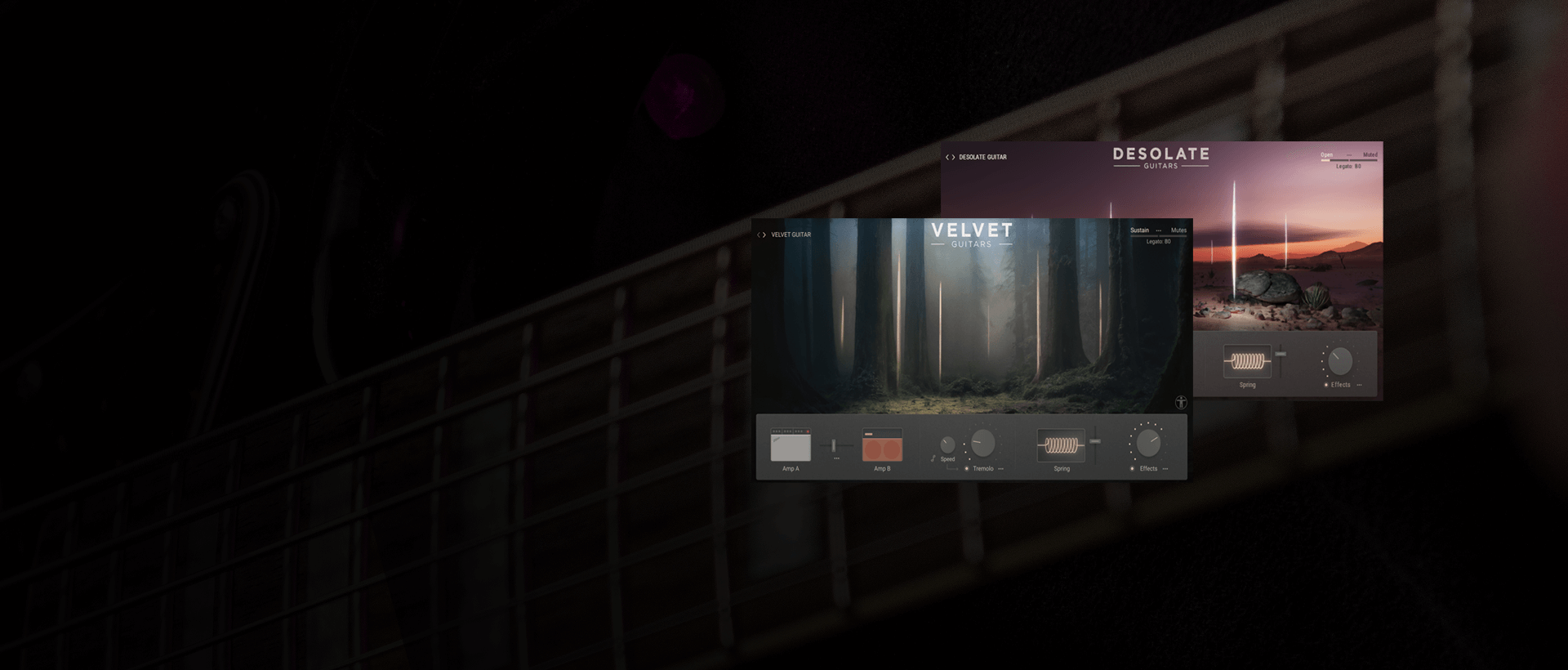 - GuitarFull Version, UpgradenulllightnoTwo atmospheric electric guitars. Perfectly complementary.OverviewThe bundle combines the twangy, atmospheric tension of Desolate Guitars with the mellow warmth and emotive glow of Velvet Guitars. From the moody, reverberant tension of Desolate to the mellow, intimate warmth of Velvet, this bundle equips creators with everything they need to shape expressive phrases, immersive atmospheres, indie riffs, textured chords, and adventurous sound design.grad3grad3lightAudio Demosgrad2lightThe InstrumentsFeature SummaryTechnical Specificationsgrad2lightRelated ProductsChoose your option belowReady to purchase?