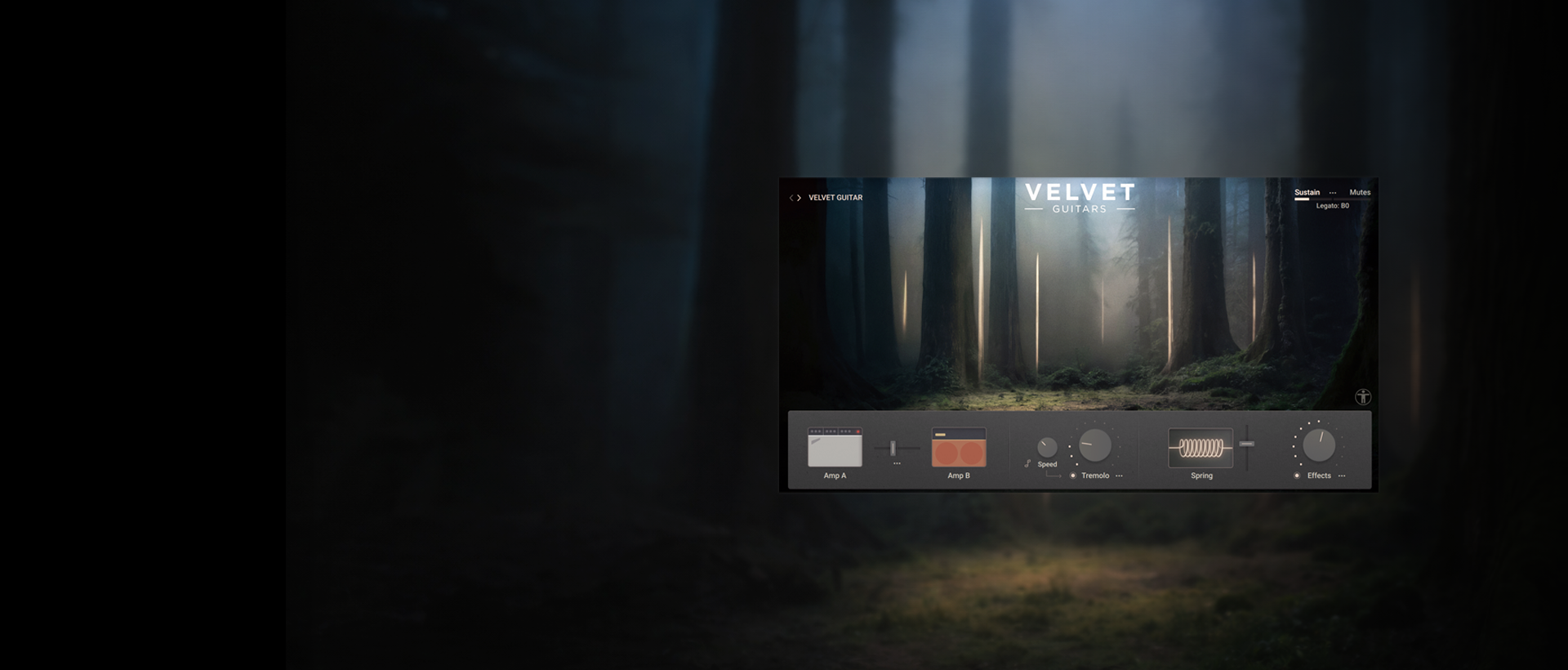 - GuitarFull Version, UpgradenulllightnoThe mellow side of guitars. Elegant warmth. Effortless mood. LIMITED INTRO OFFEROverviewVelvet Guitars elevates classic guitar tones with a warm, emotive glow. From gentle sustains to imaginative soundscapes such as toothbrush-played strings and bowed, evolving textures, it offers a uniquely emotional palette of sounds. With five signature guitars, two iconic amps, real spring reverb and expressive FX, Velvet transforms every idea into a rich and evocative creation.grad3grad3lightAudio DemosnulllightFeature SummaryTechnical Specificationsgrad2lightRelated ProductsChoose your option belowReady to purchase?